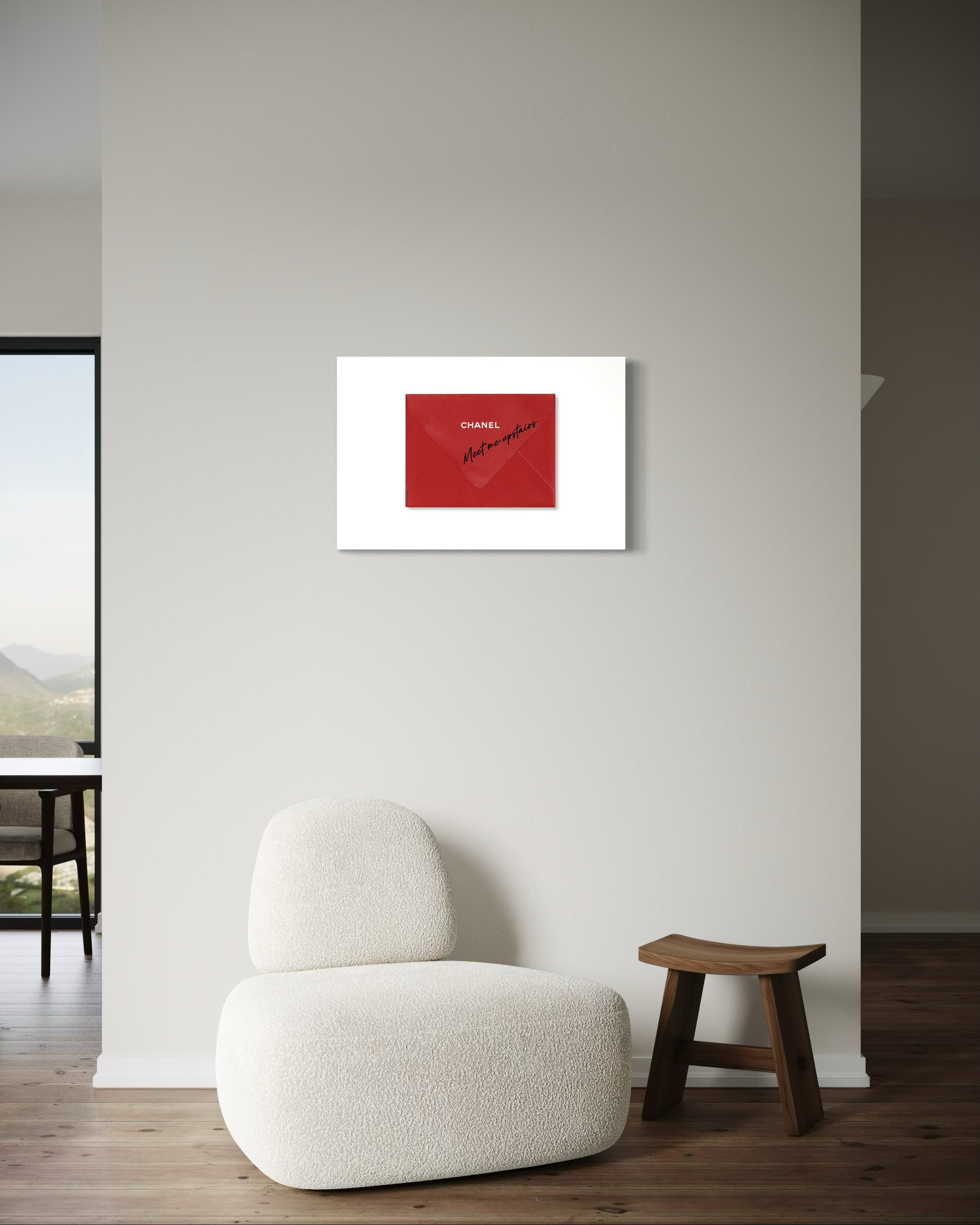 Dale personalidad a tu espacio con este cuadro minimalista en blanco con una carta roja y la palabra Chanel, acompañado de la frase “Meet me upstairs”.