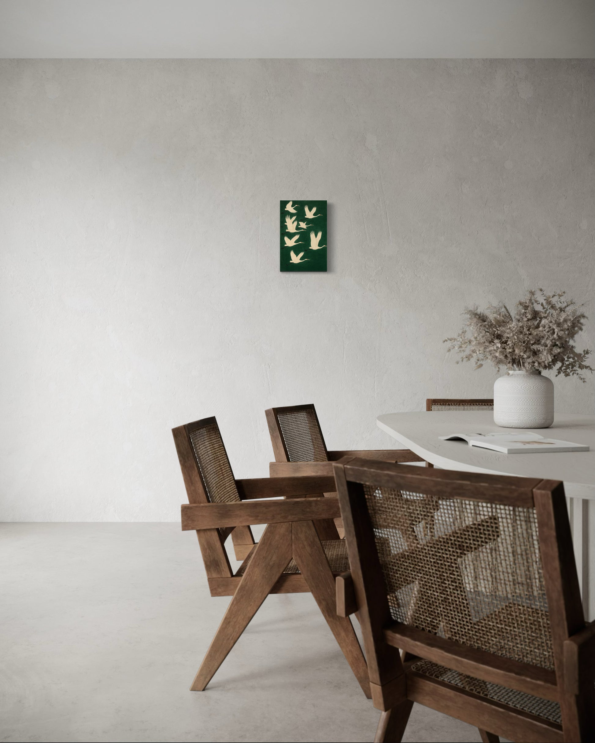 Decora tu espacio con este cuadro canvas que presenta un fondo verde y pajaritos volando en tonos beige, creando una sensación de calma y armonía.